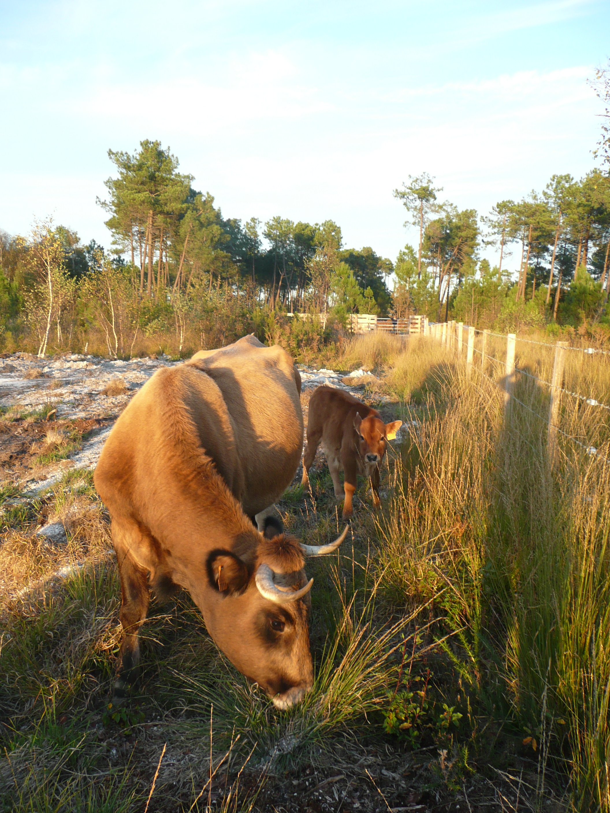 Après l’étude de faisabilité, une parcelle de 10 ha a été clôturée avec la réalisation d’installation pour les bovins. Le choix de la race utilisée s’est naturellement porté vers la vache marine qui est adaptée à ce type de milieu. Le Conservatoire et la Sepanso gèrent conjointement la race qui est par ailleurs présente dans les Réserves Naturelles de Cousseau, de Bruges et différents sites naturels des Landes avec la Fédération des chasseurs. Les enclos ont été réalisés durant l’été 2012. Le 29 octobre 2012, 4 animaux ont été introduits sur le site : Falco, le taureau, 2 vaches Rosita et Lobélie et un jeune veau.