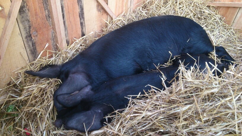 deux truies de la race de porc gascon venant de l’élevage d’Isabelle Ortusi, éleveurs de porcs, moutons landais et poules gasconne à Cestas (33) .