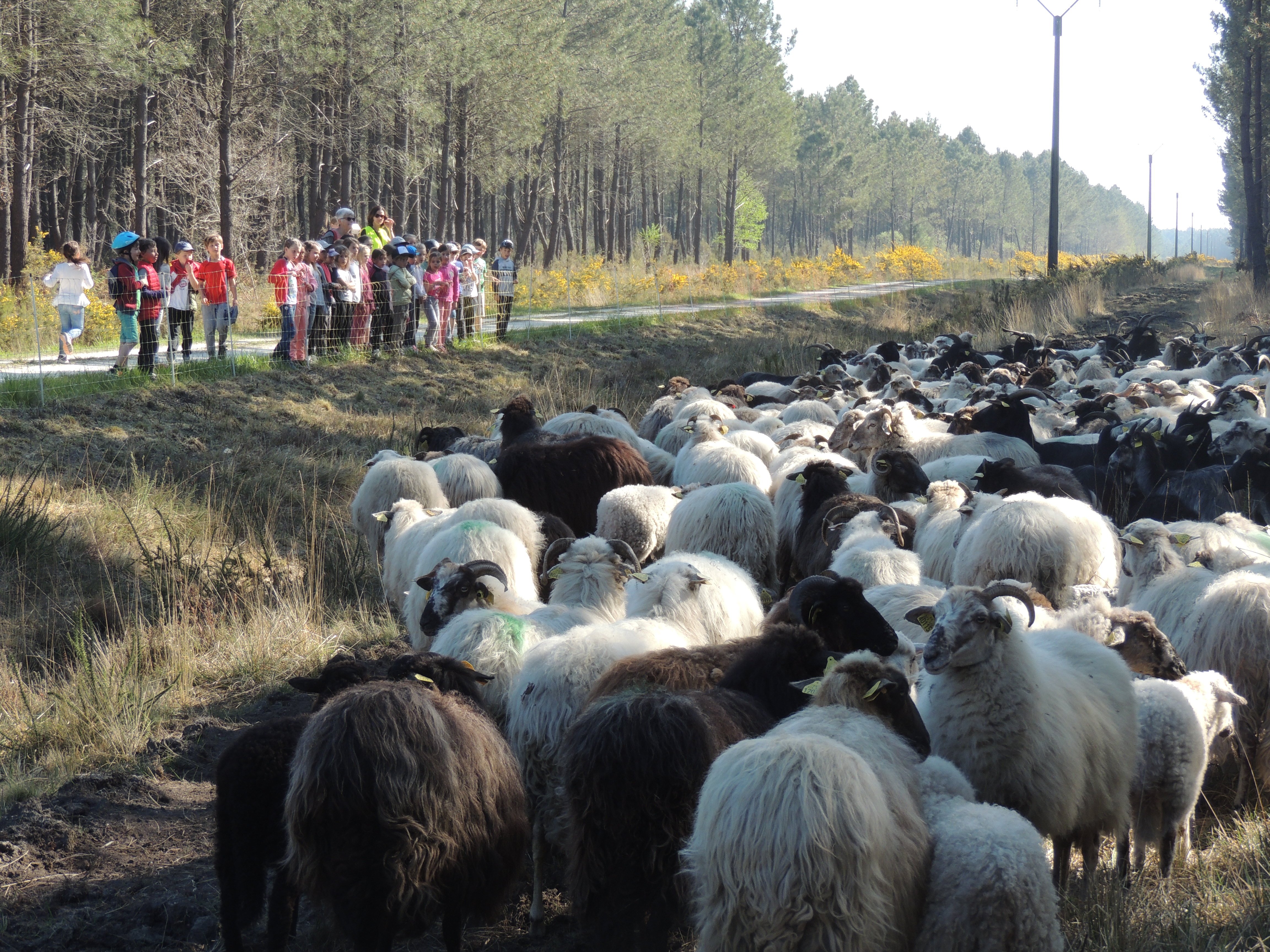 Le départ de cette transhumance a été l’occasion de rassembler trois classes de l’école élémentaire Molière (St Aubin de Médoc) qui suivent le troupeau depuis le mois de septembre dans le cadre d’un projet "Découverte du mouton Landais et d’un ancien courtiou au sein de Bordeaux Métropole".