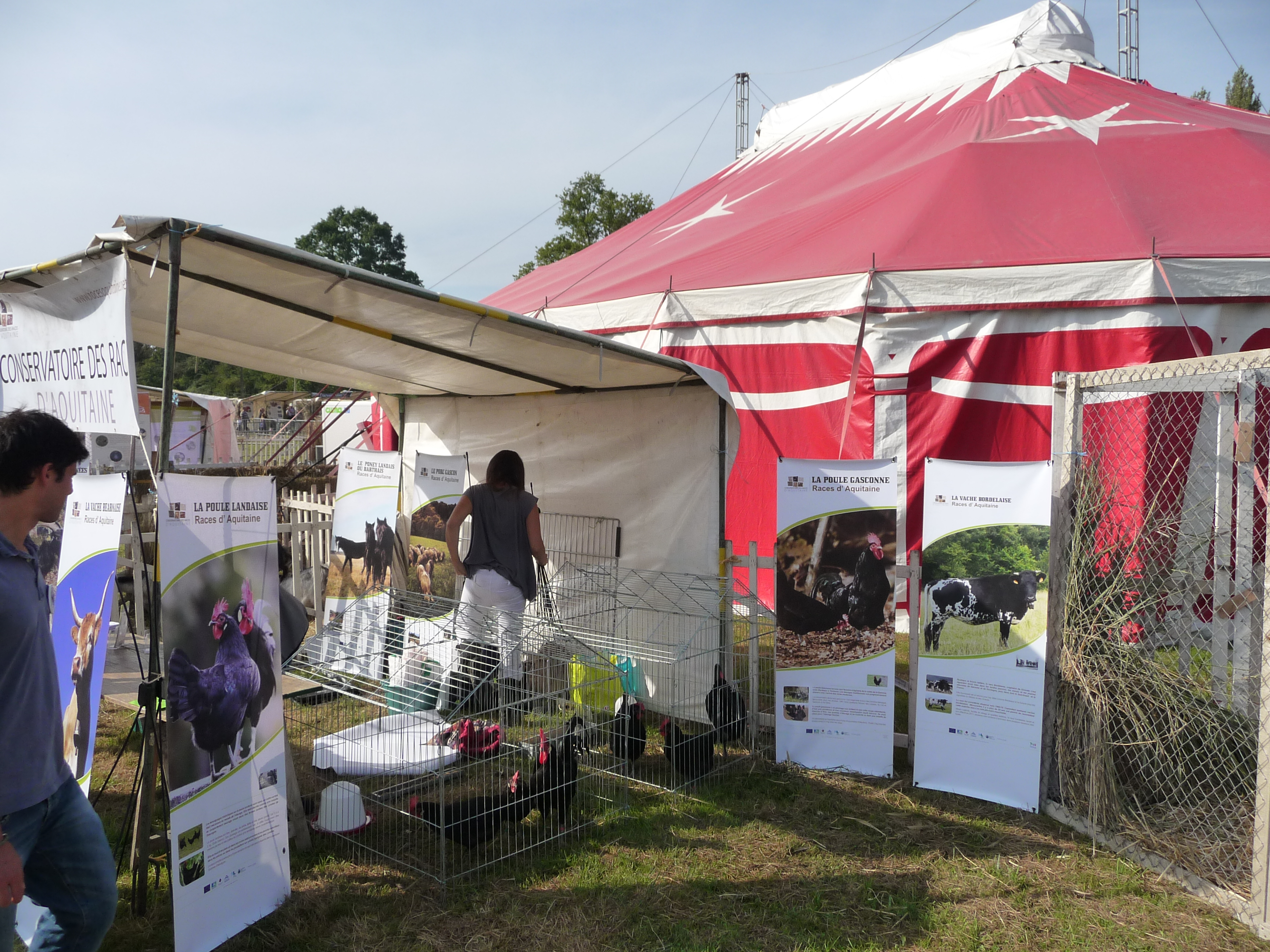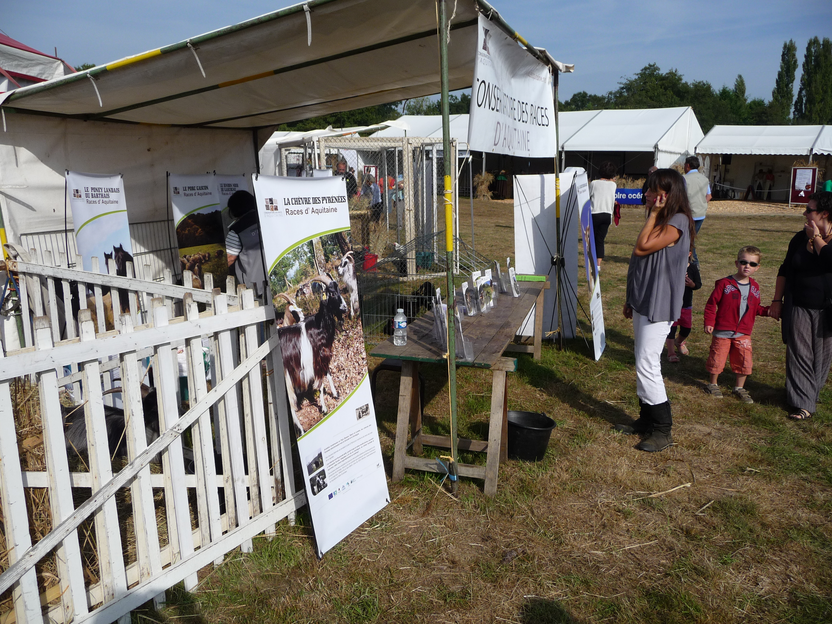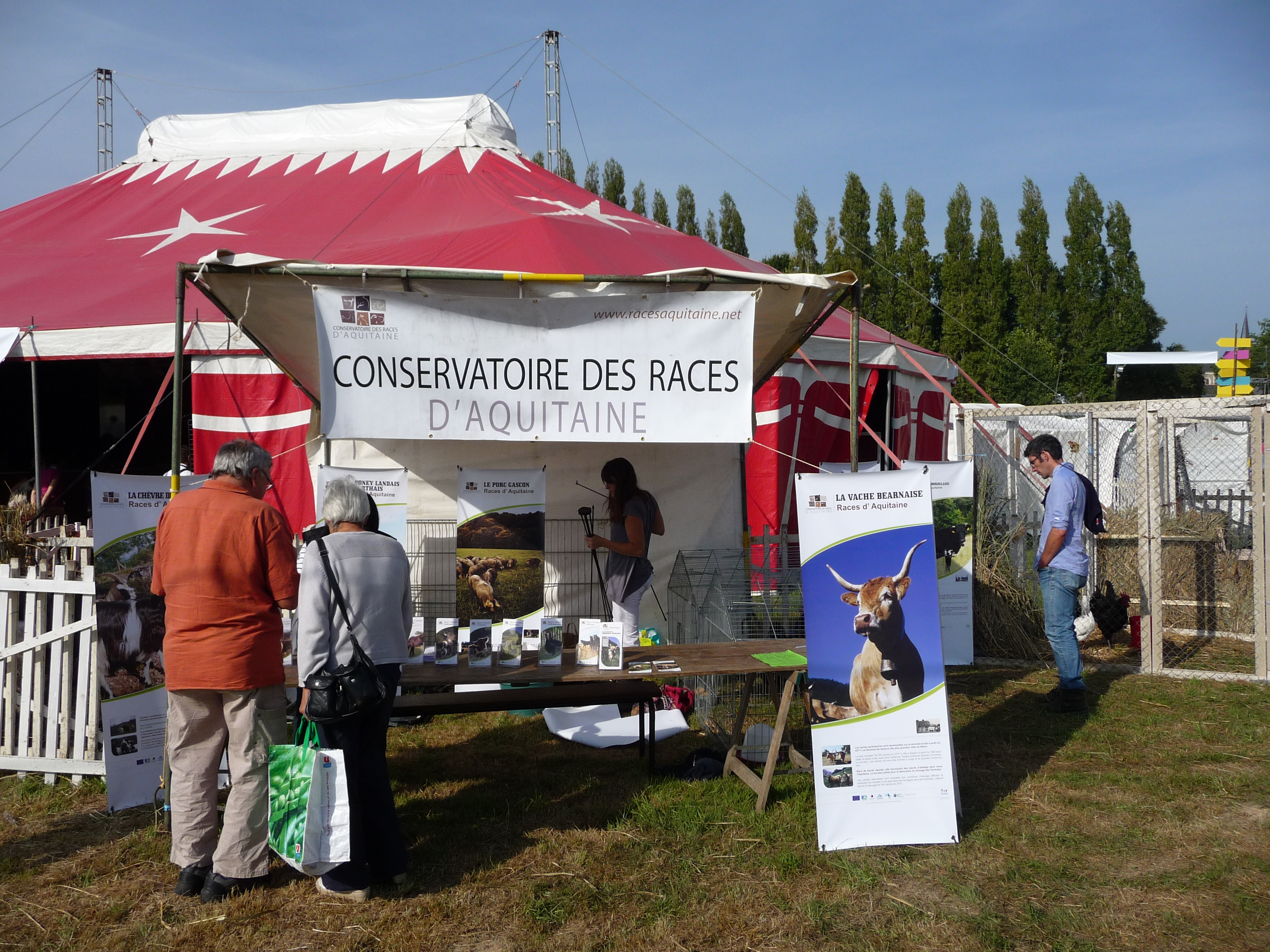 Invité par les organisateurs, le Conservatoire des Races d’Aquitaine a tenu un stand et présenté un échantillon de races : moutons landais, chèvres des Pyrénées, poules gasconnes et poules landaises ainsi que les panneaux d’exposition des races de la Région.