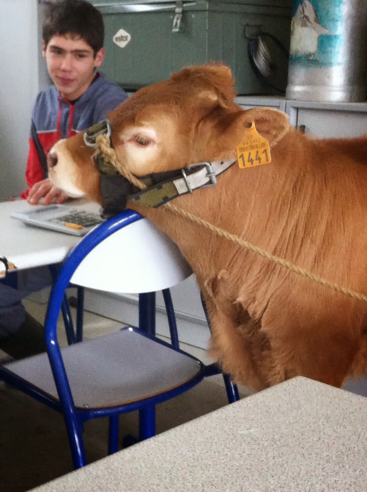 Les six élèves accompagnés de leurs enseignants ont présenté une superbe vaches béarnaise, Mignoune et son veau Iluro.